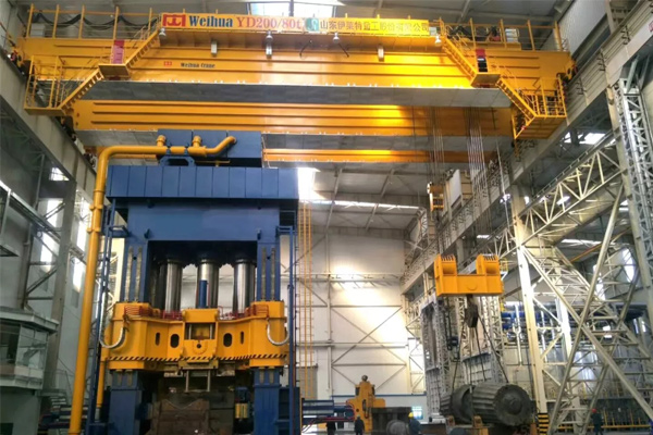 When the forging crane is working, the main and auxiliary hooks cooperate to lift the forgings, and the forgings are rotated by the special spreader. Adjust the forging to a suitable angle, put it on the cutting board of the hydraulic press, and the hydraulic press starts to work until the forging is forged into a qualified product. Since the crane will be subjected to relatively large shock loads during the forging process, it is equipped with a buffer device and a brake release device.